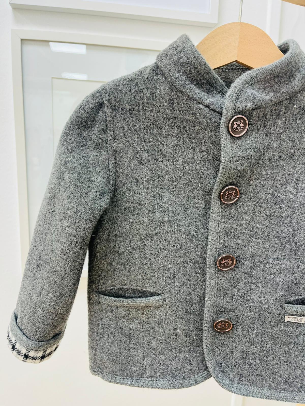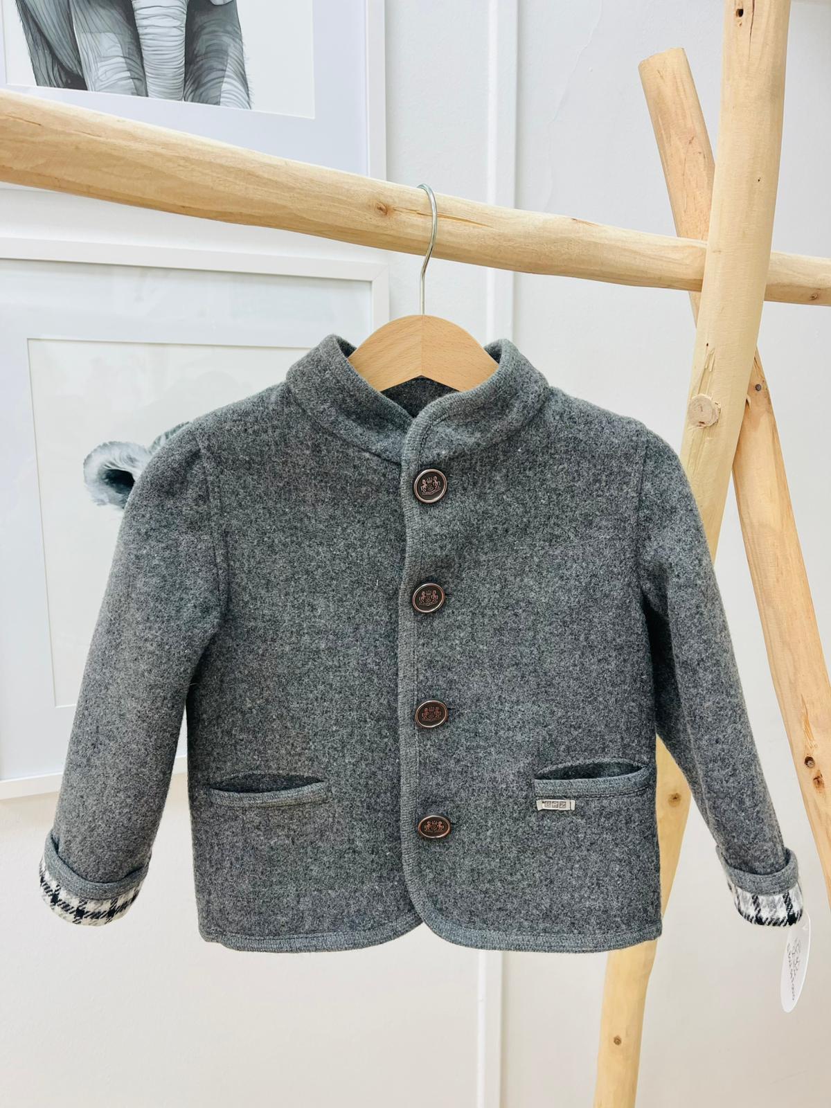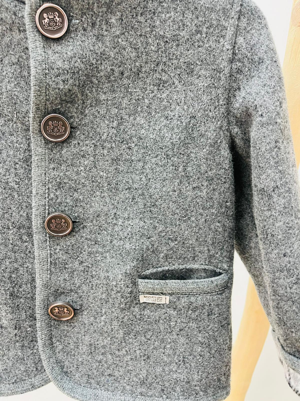 Chaqueta de estilo austriaco es perfecta para los días fríos. Confeccionada en un tejido de lana mezclada, ofrece abrigo y comodidad sin perder ligereza. Su diseño clásico en color gris se complementa con delicados ribetes en contraste y botones frontales decorativos de inspiración tradicional, que aportan un toque distintivo y encantador.