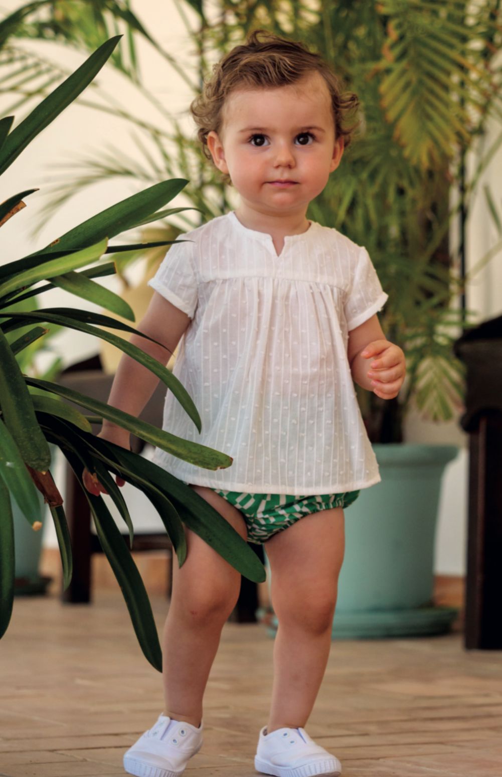 Camisa Blanca de manga corta ,con detalle en el cuello y cierre trasero con botones .