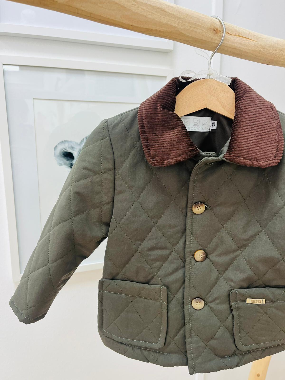 Chaqueta acolchada en verde oscuro con cuello marrón chocolate en tejido pana.