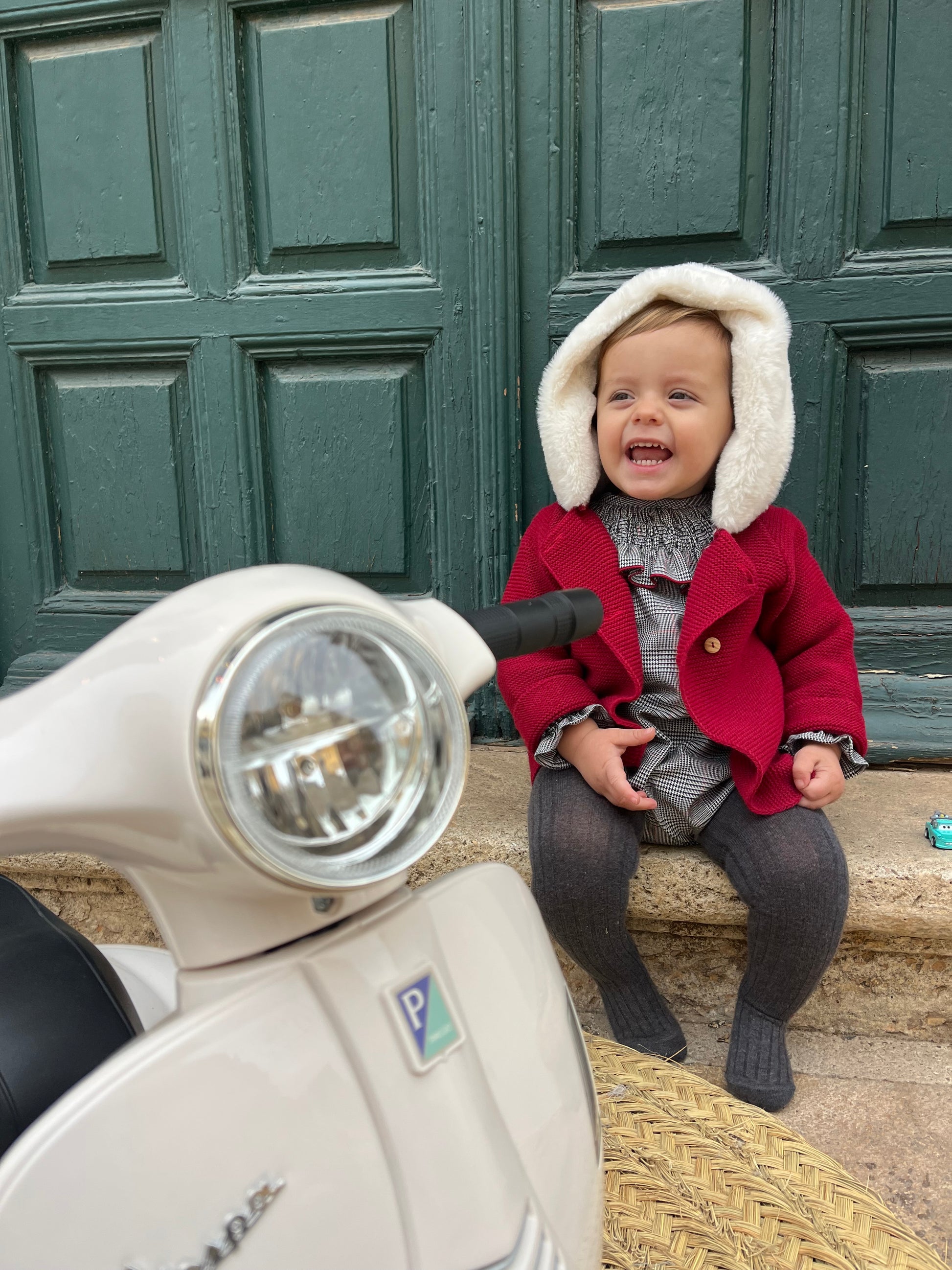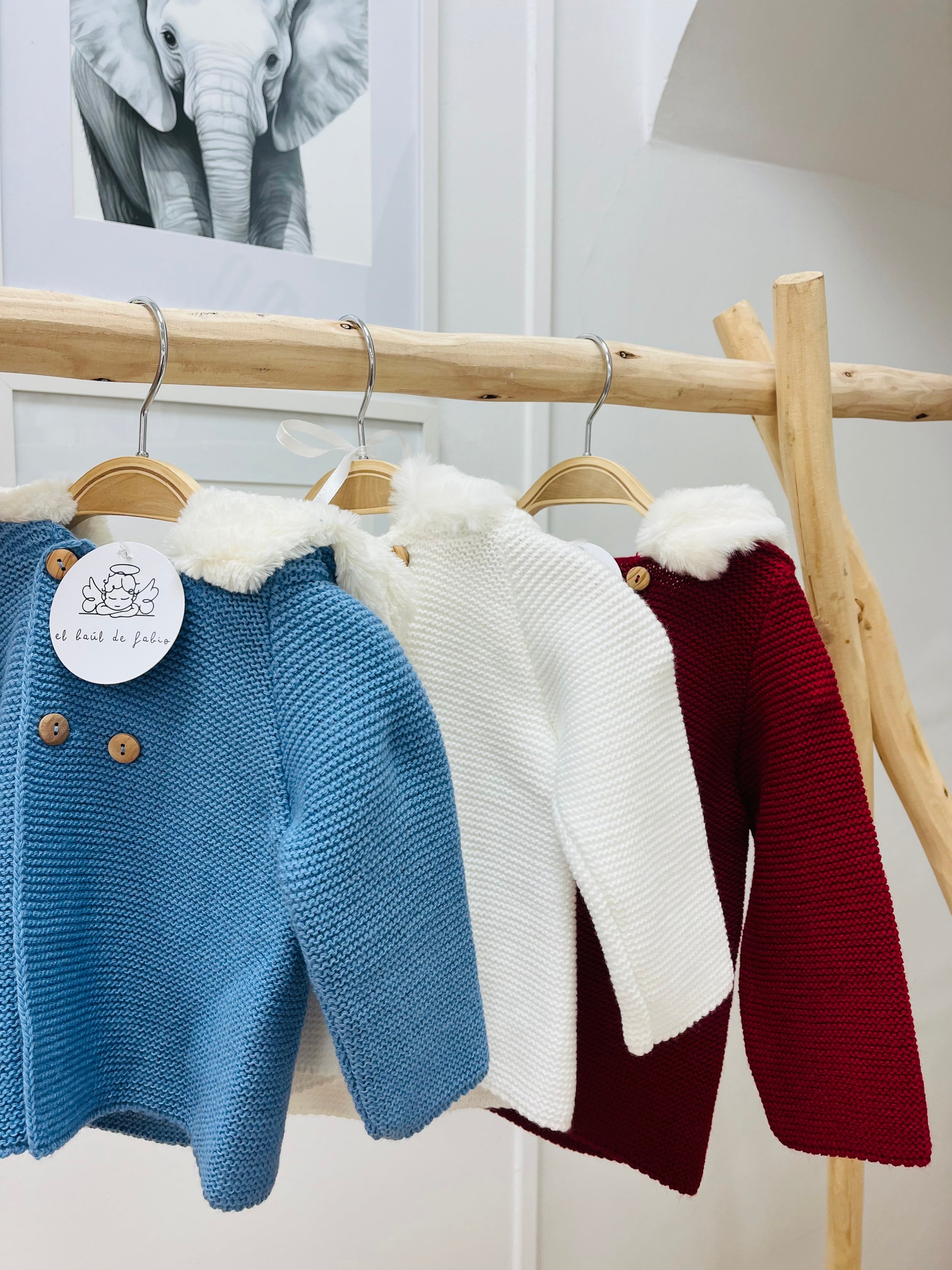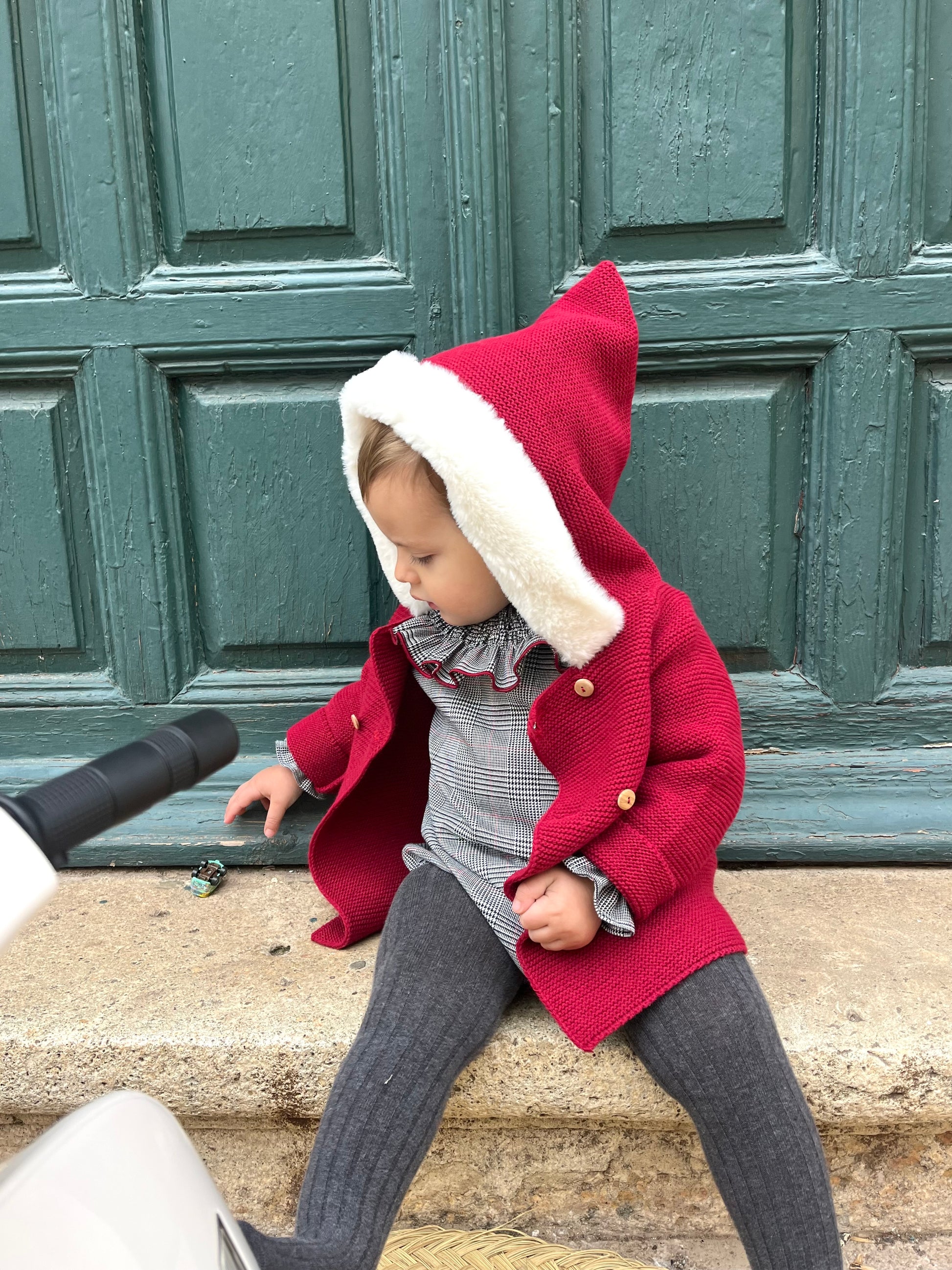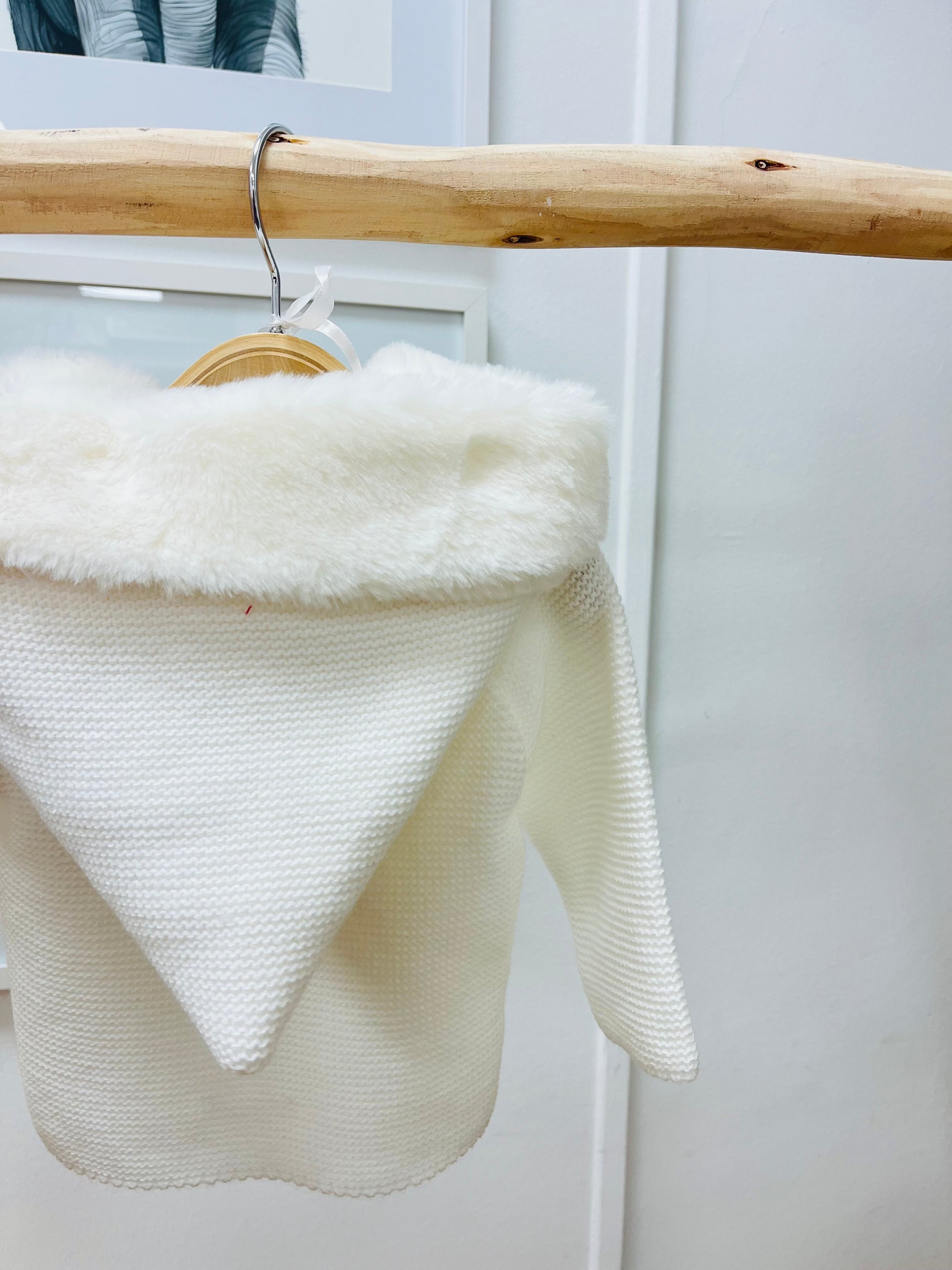 Chaqueta de punto con maxi capucha de pelito y cierre con botones de madera.