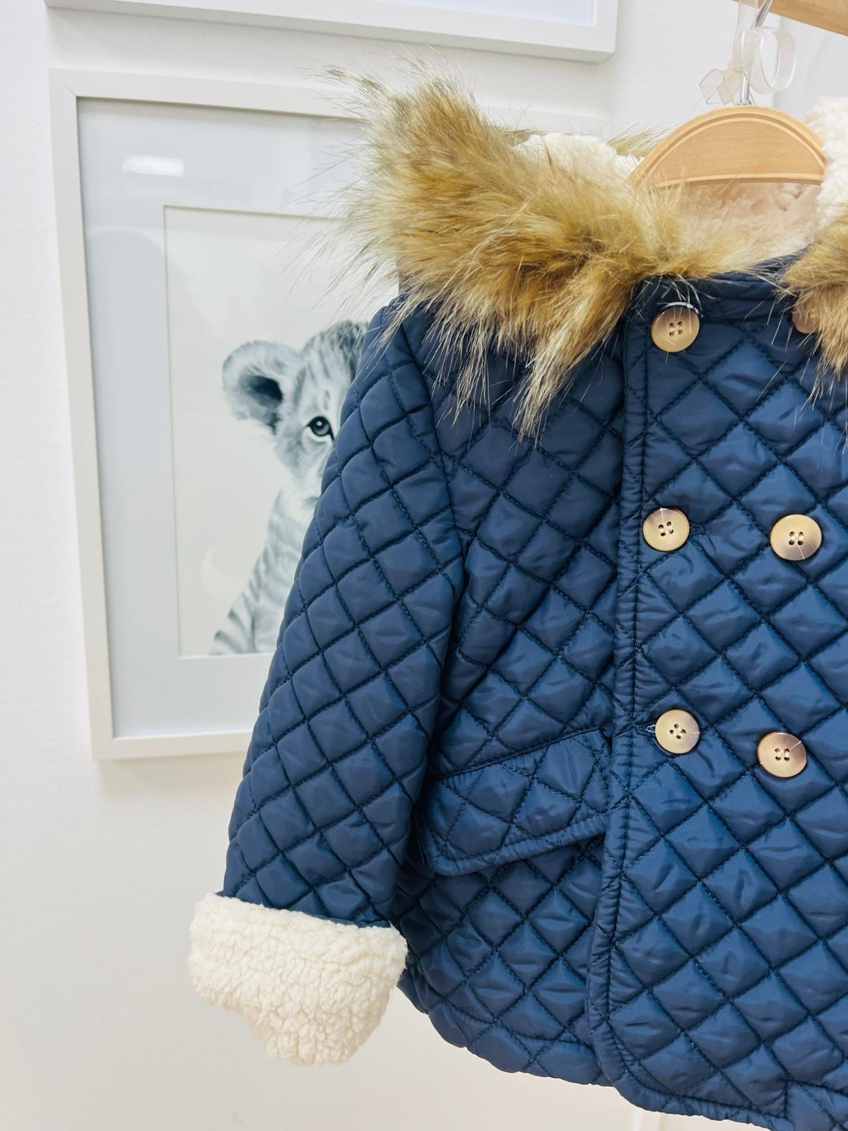 Chaqueta Acolchada en azul marino, interior forrado con borreguito y pelito en la capucha.