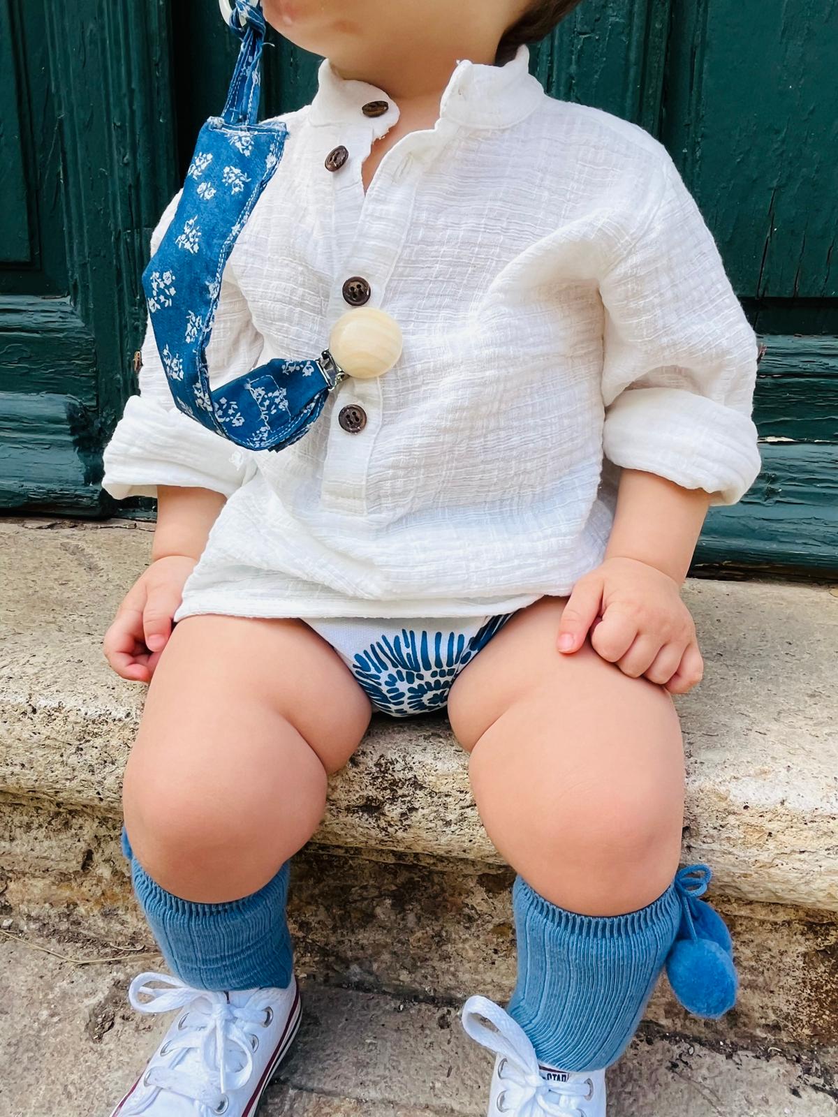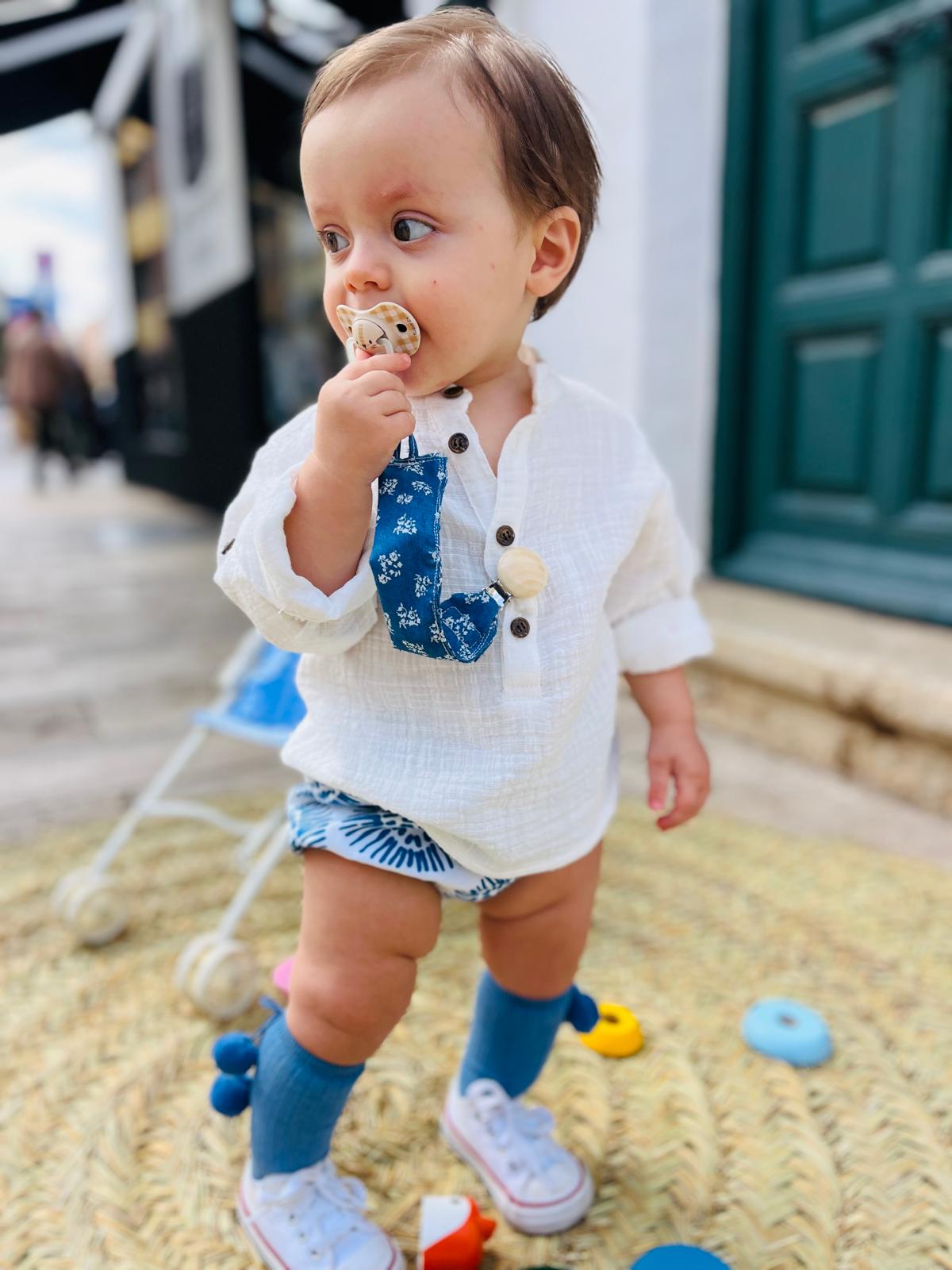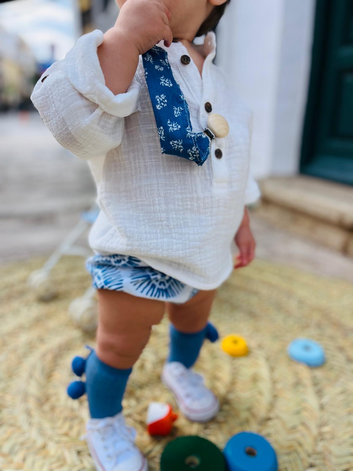 La camisa blanca de lino que aparece en la foto esta en el apartado de niño.