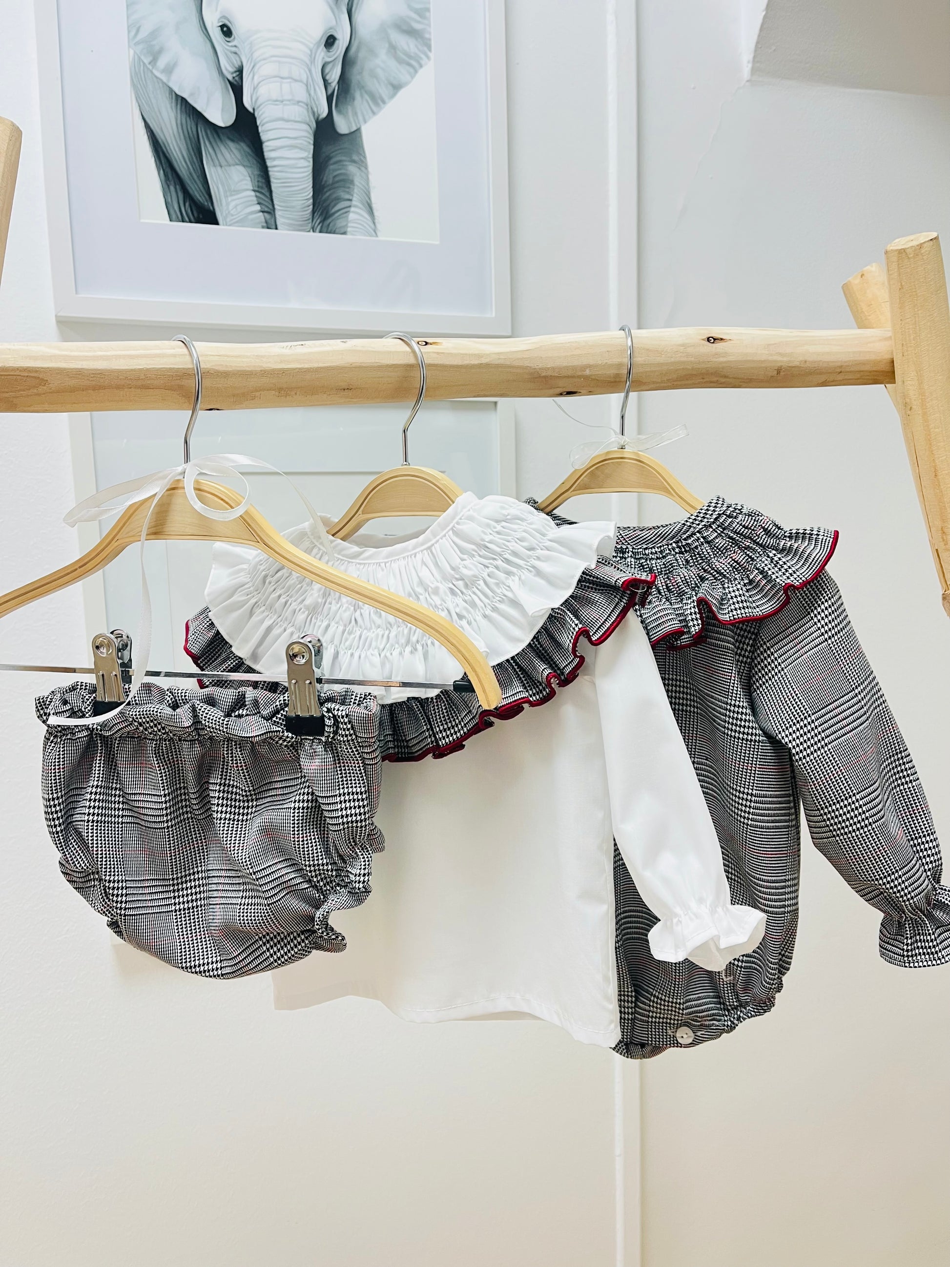 Cubre pañal colección Viena con estampado de cuadros grises y Burdeos, lleva goma en la cintura.