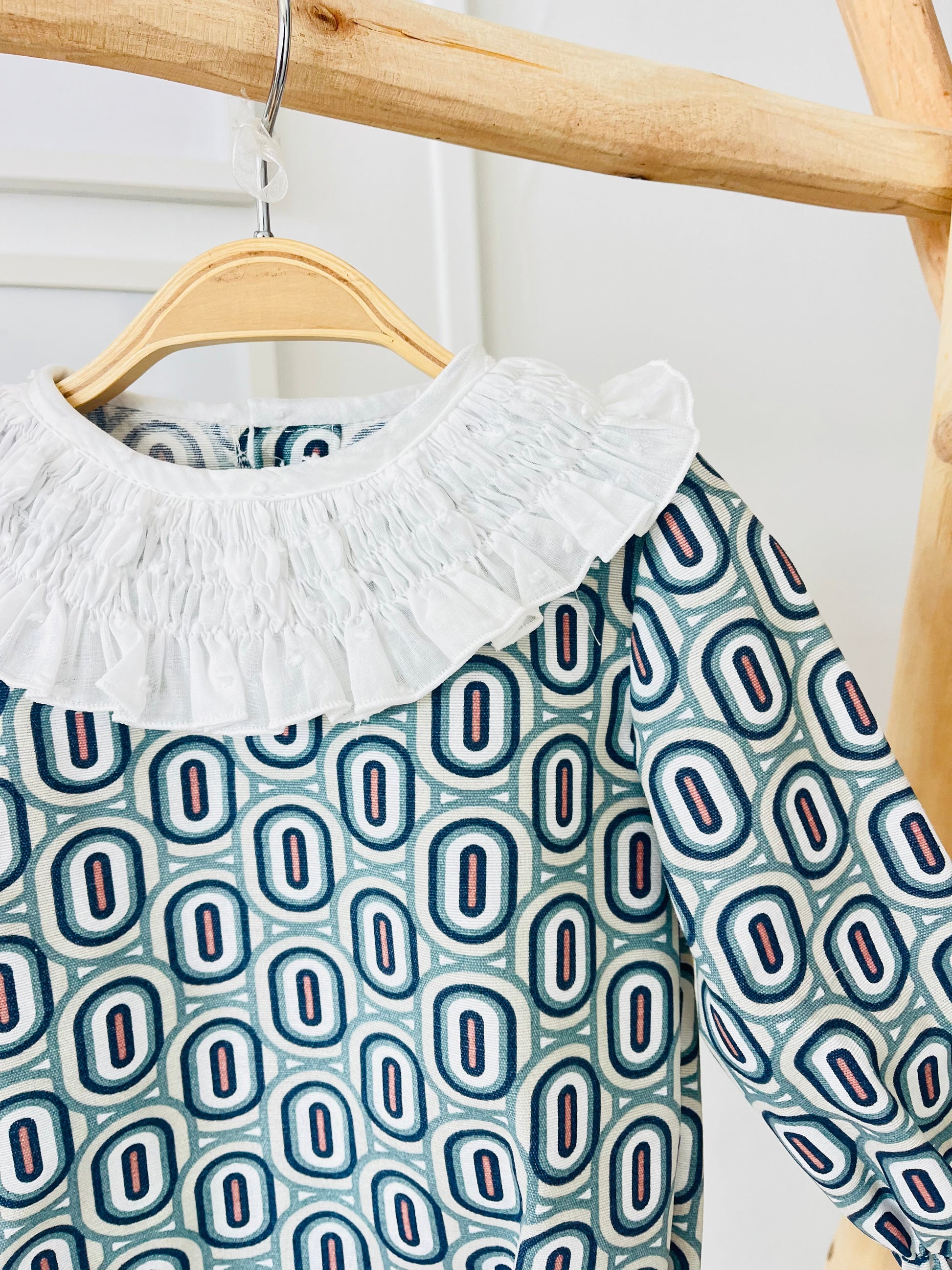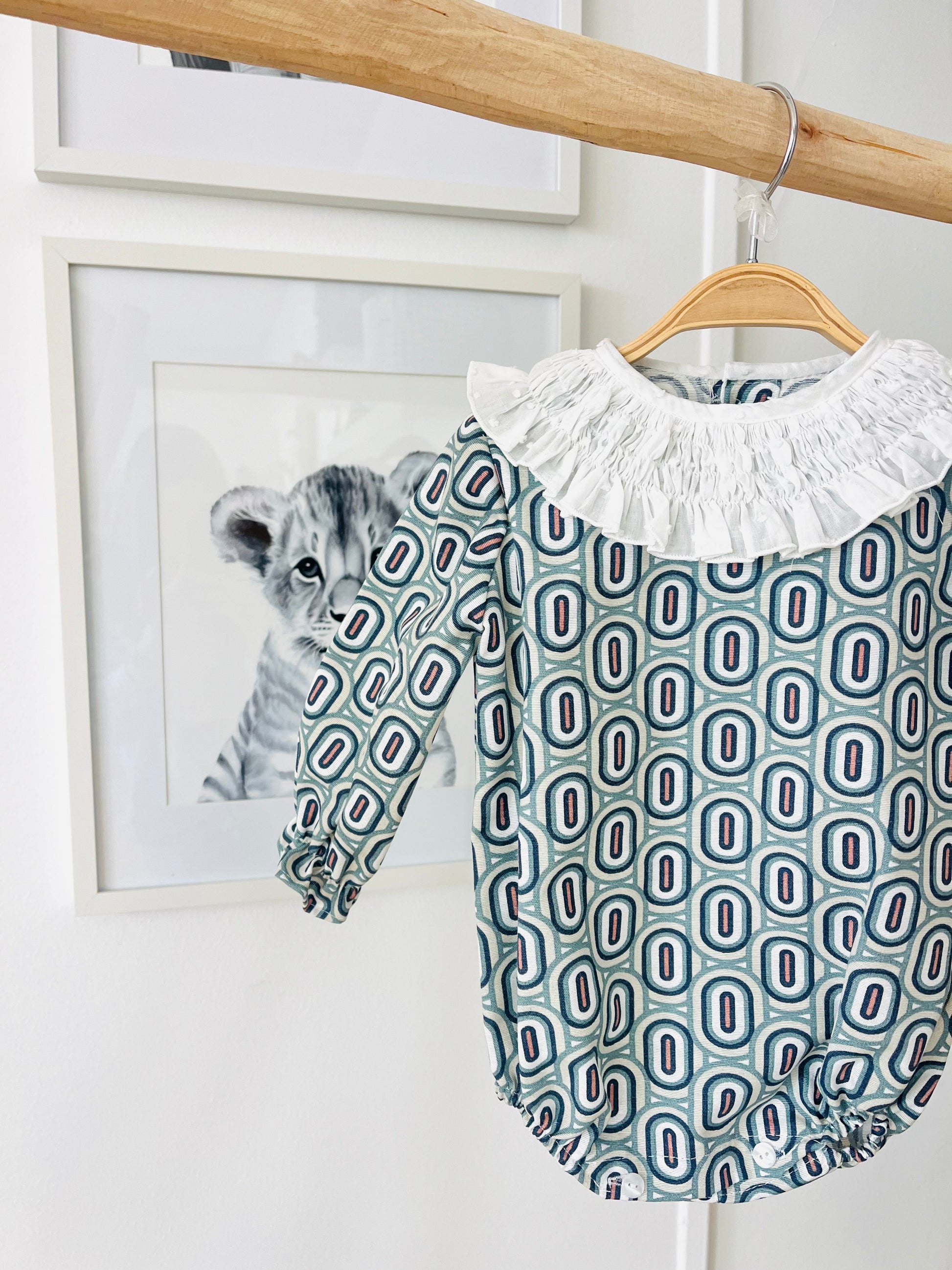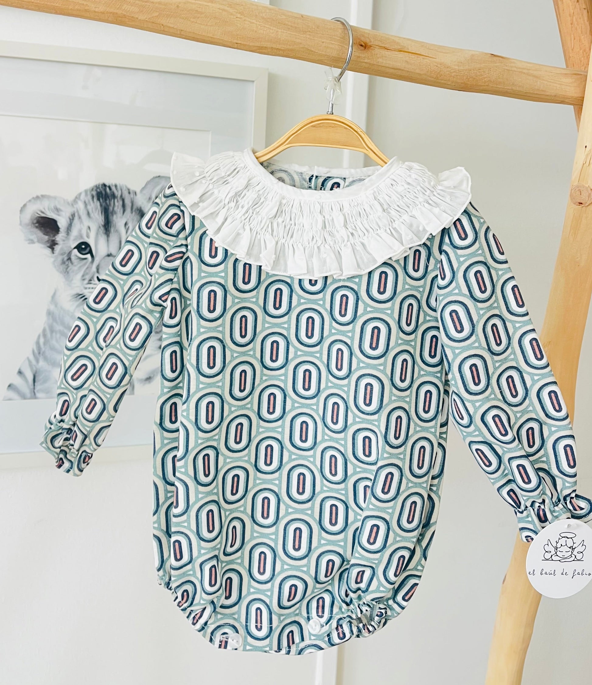 Pelele con estampado Multi color y Maxi cuello en plumeti blanco.