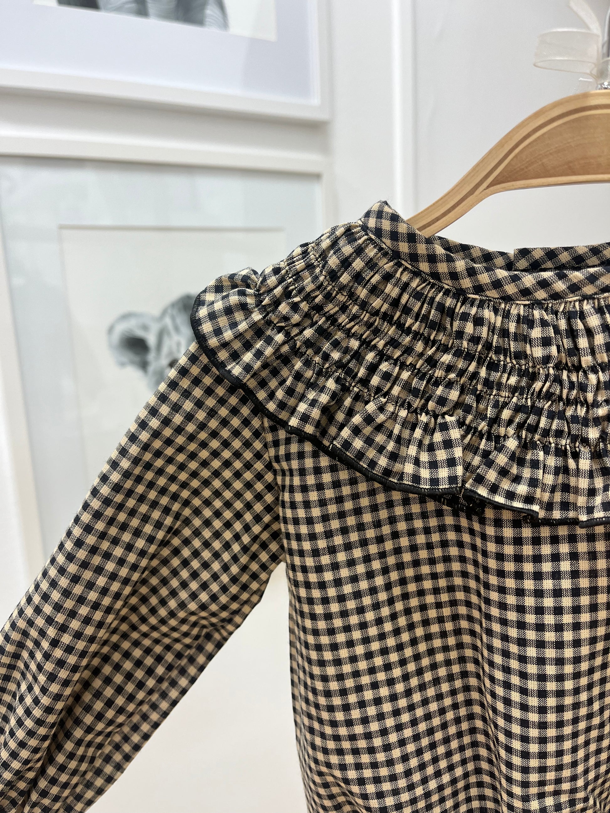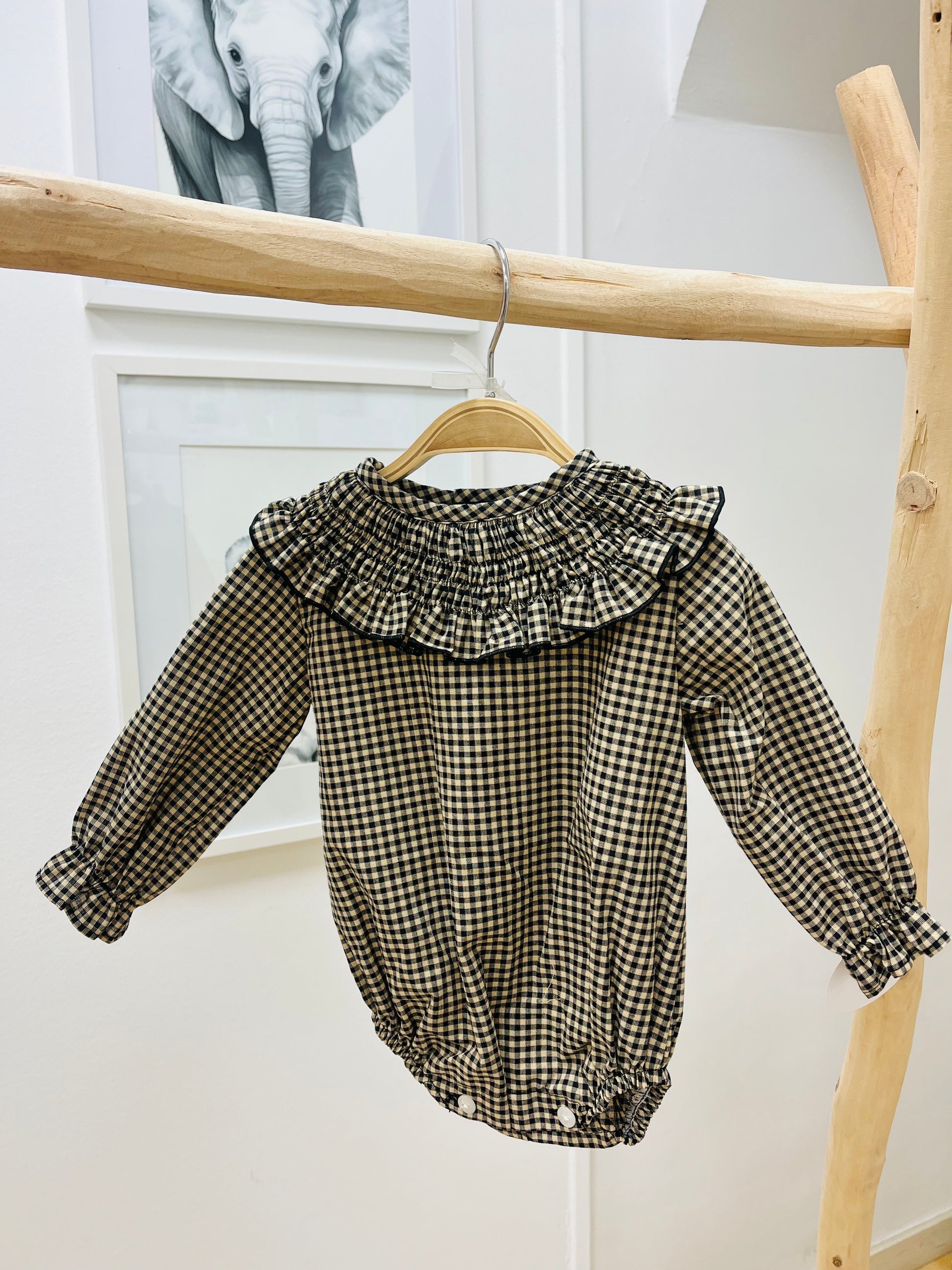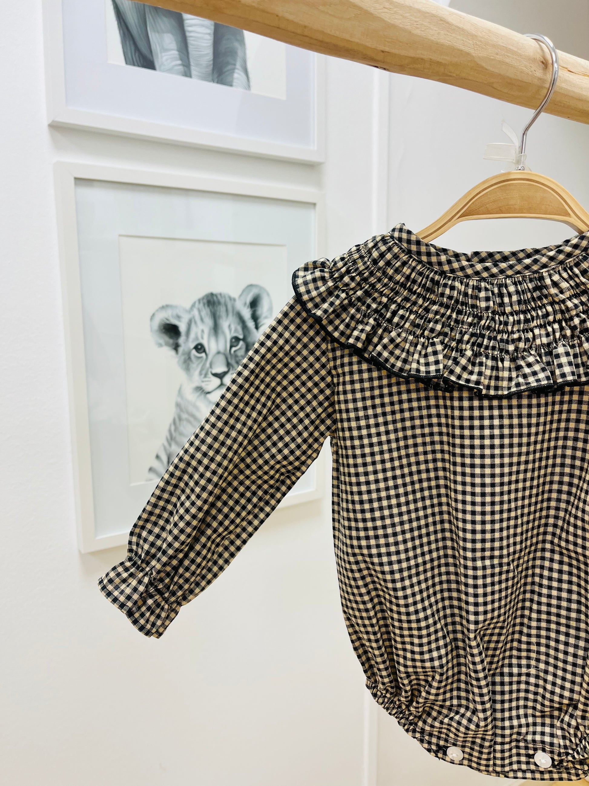 Pelele en cuadro Vichy camel y negro con Maxi cuello al tono.