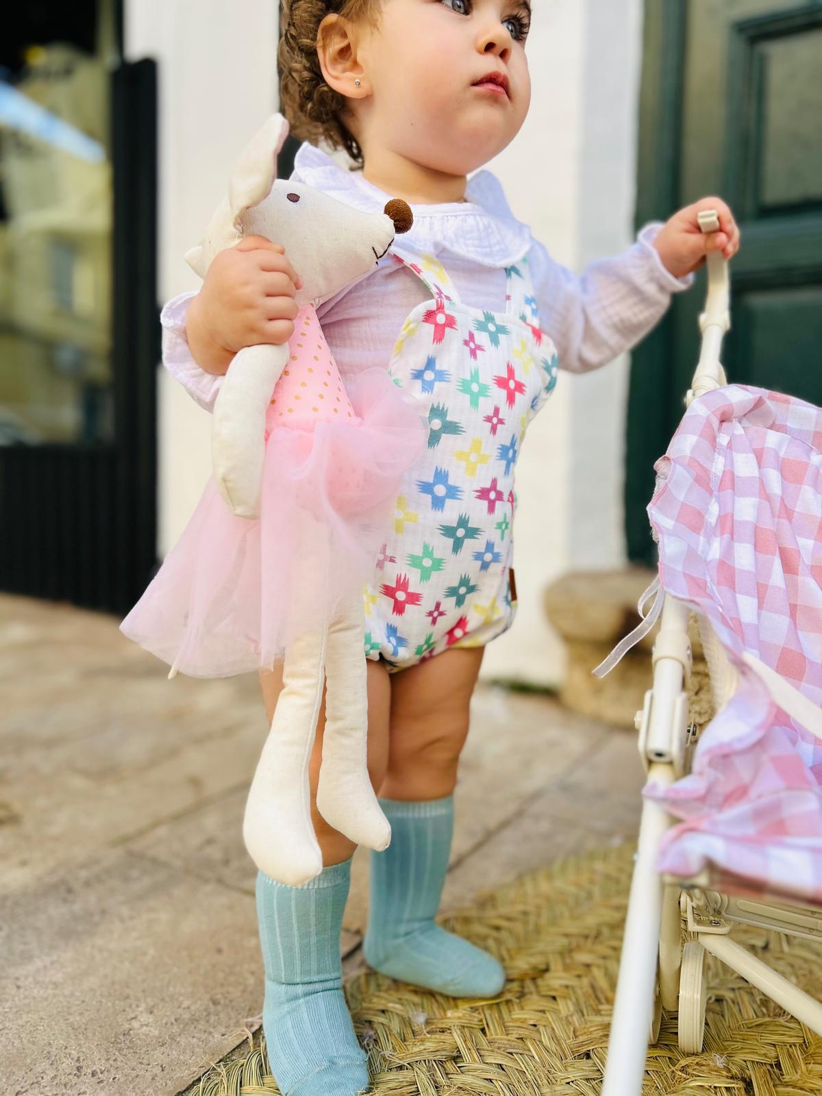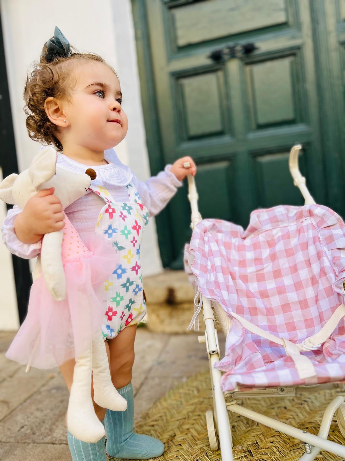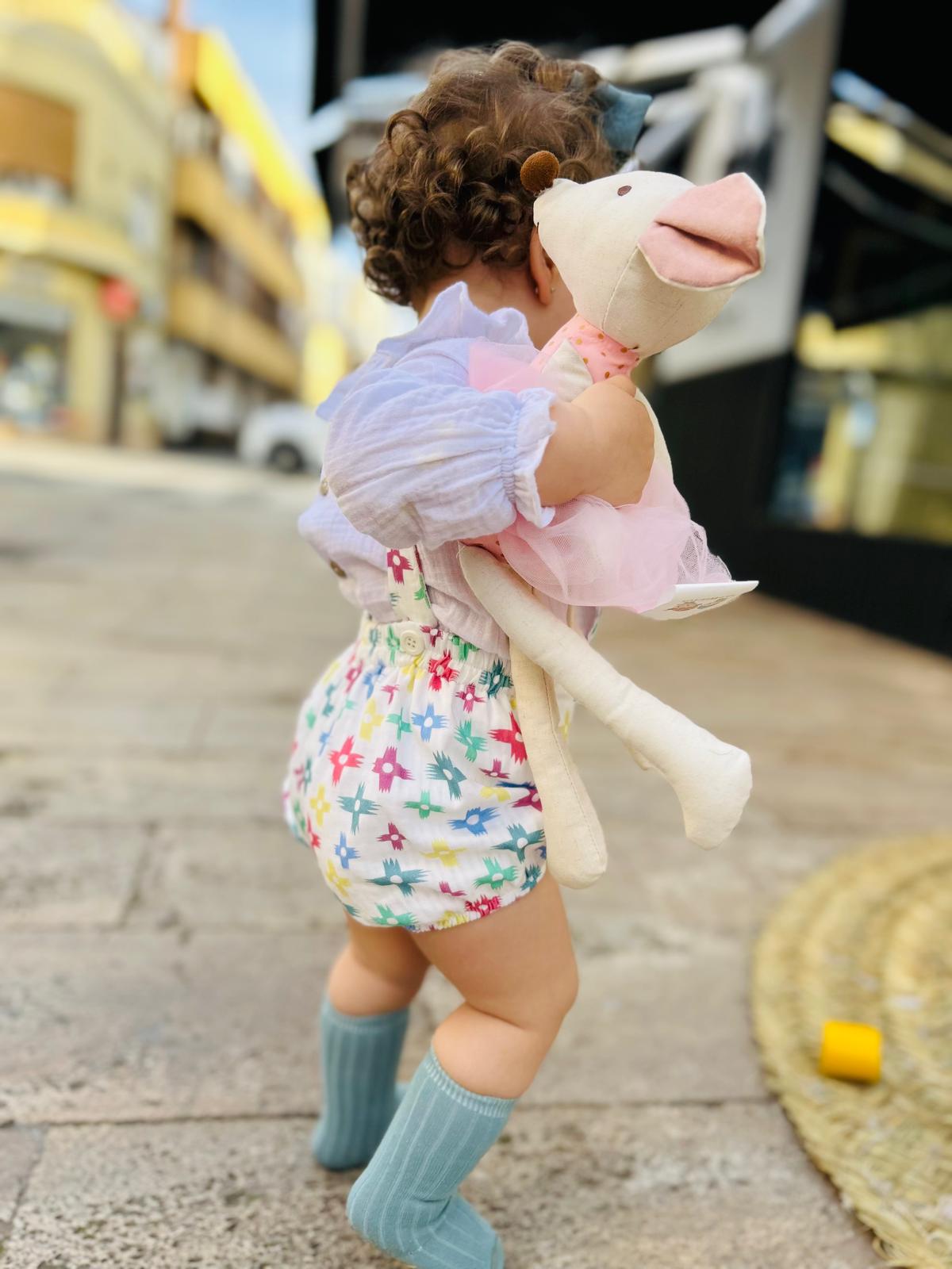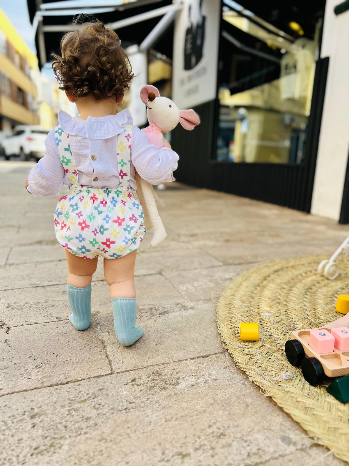 Peto de bambúla , con tirantes ajustables con botones y goma en la parte baja .