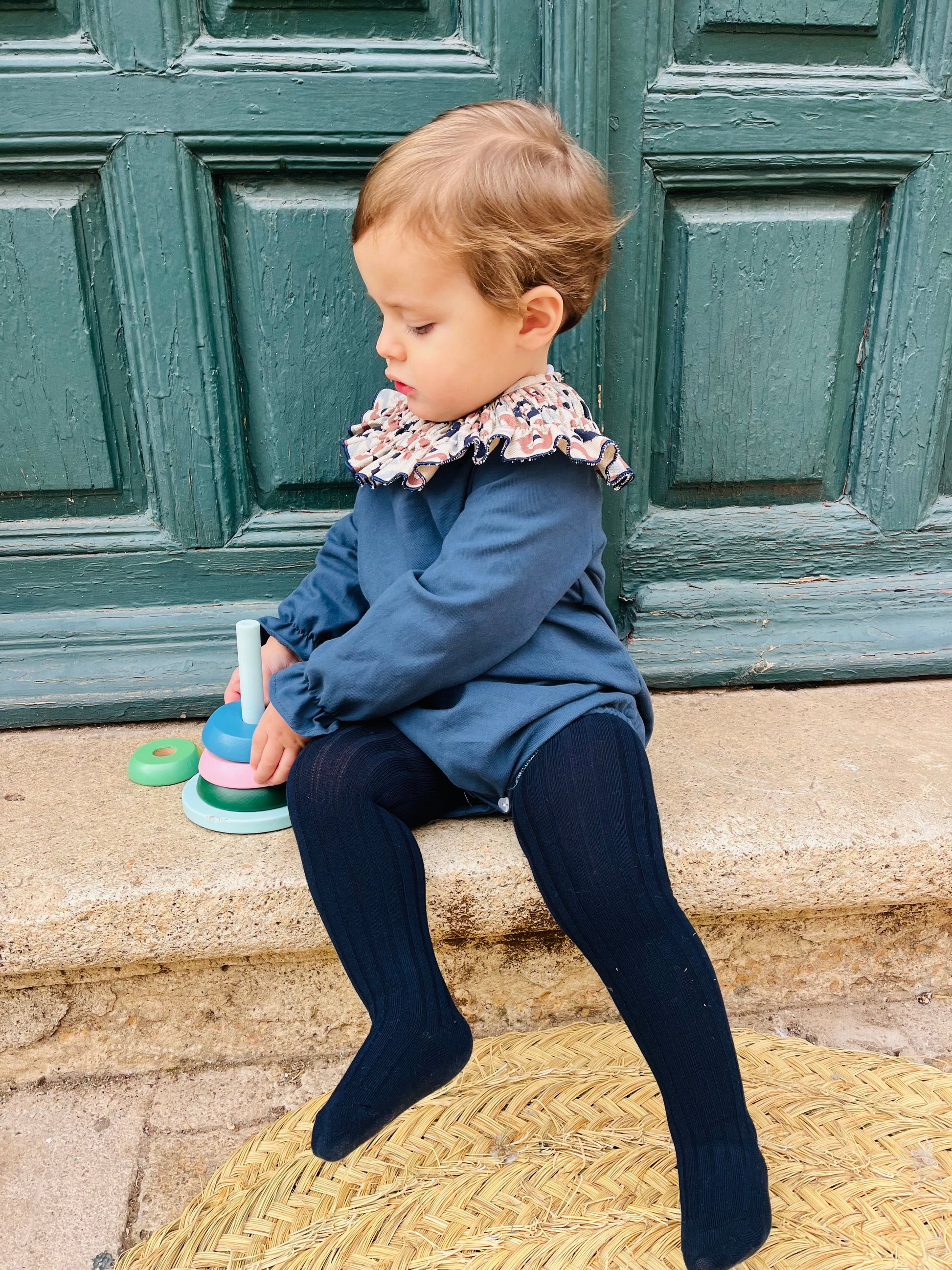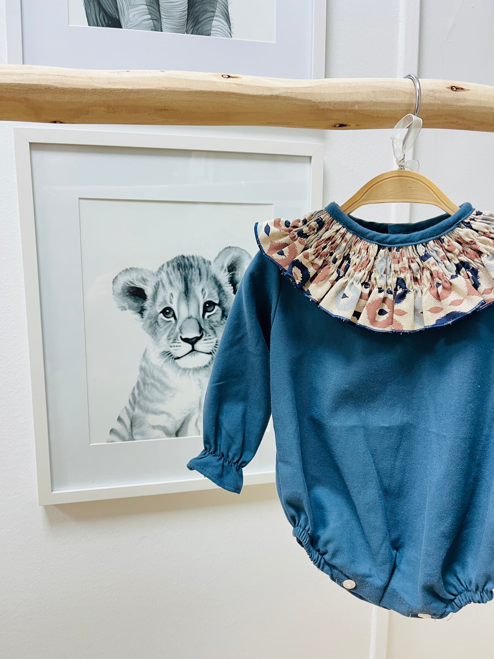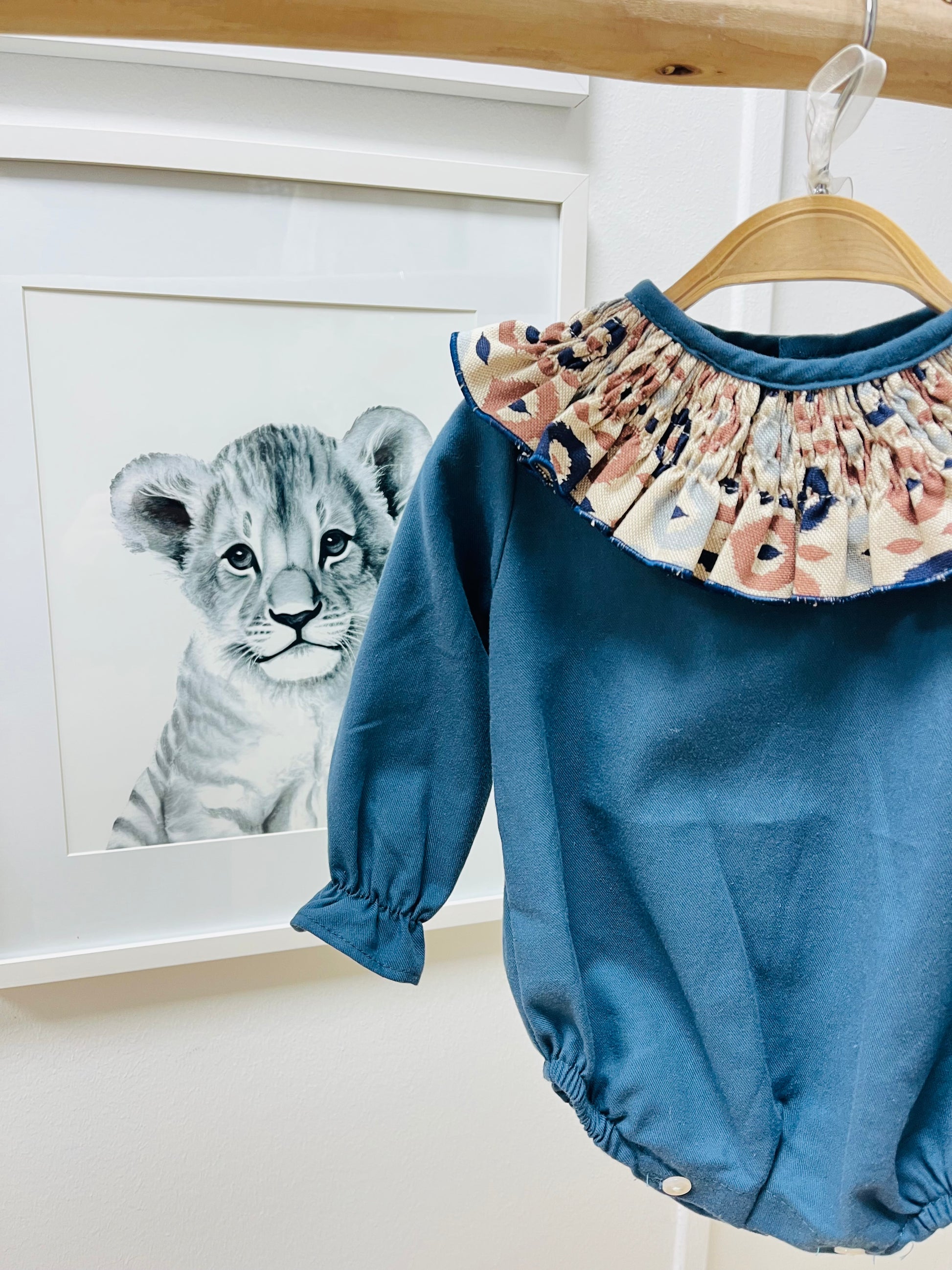 Pelele colección Theo con Maxi cuello estampado y parte inferior en azul petróleo.